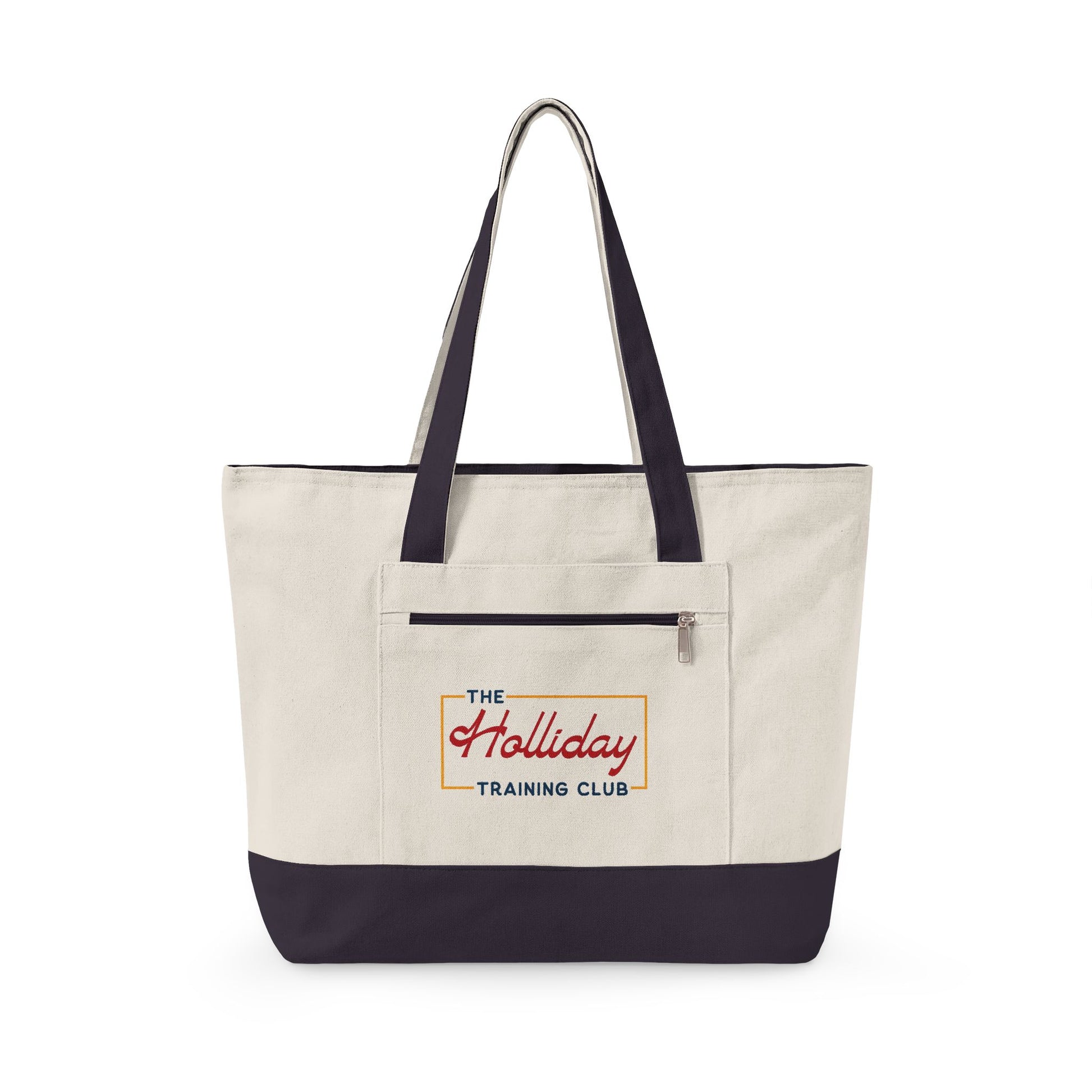 This zippered canvas tote brings an old-school Charleston vibe to your daily rhythm. The 1980s-inspired Holliday Training Club logo sits crisp on heavy cotton canvas, reminding you of early-morning drills, warm brick streets, and the focused energy that follows. It carries groceries, gym gear, notebooks, or a laptop without sagging. The exterior pocket keeps keys and cards at hand while the full zipper on the main compartment keeps everything where you left it. Wear it over a shoulder or sling it across your arm—this tote moves with the kind of easy confidence that belongs to people who train hard and live deliberately.