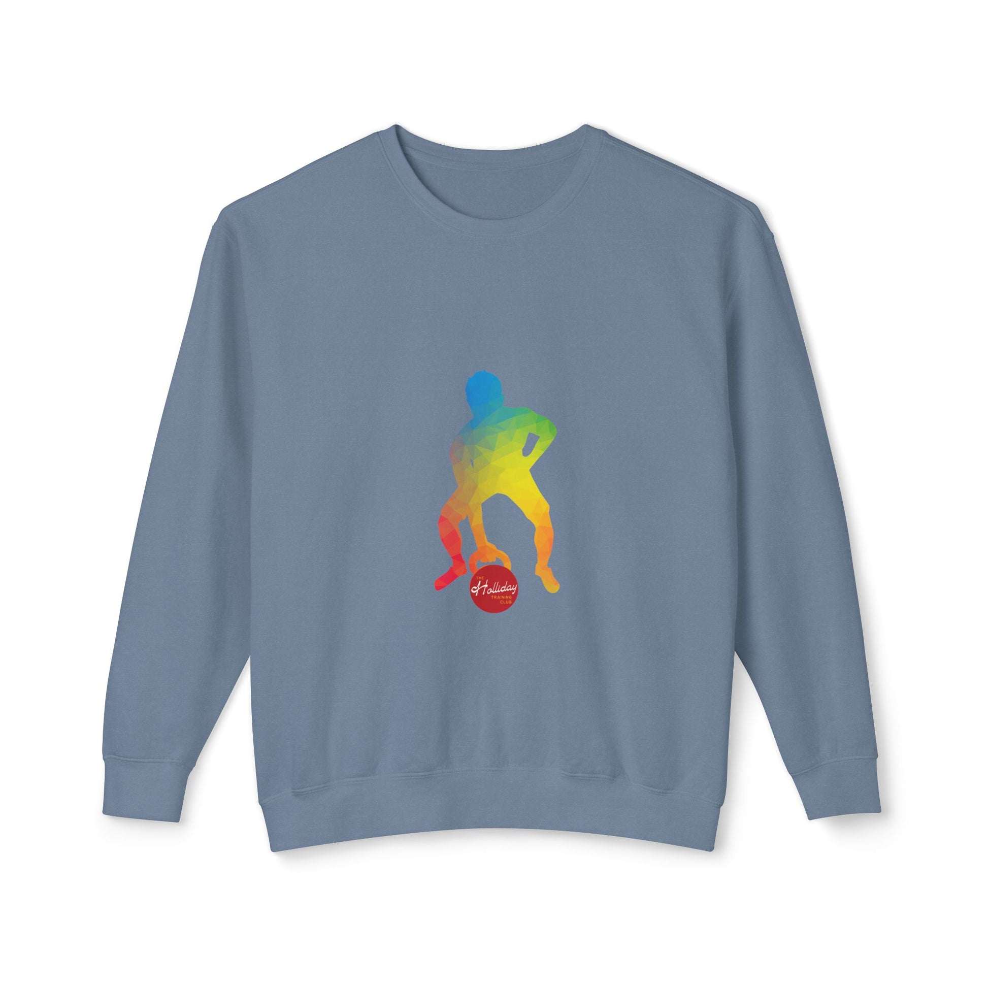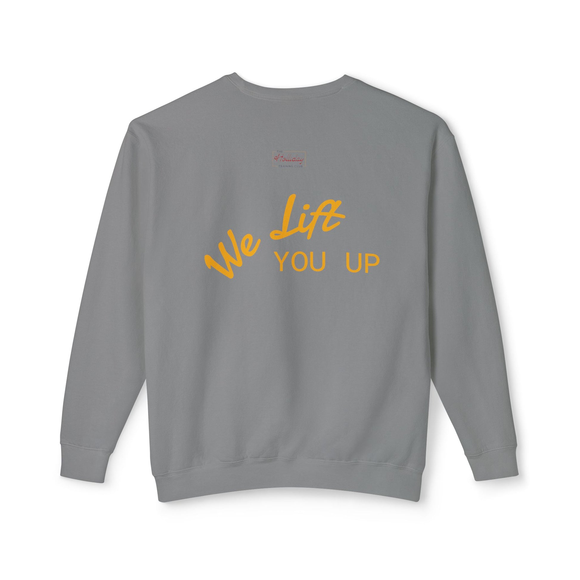 Colorful, lightweight Holliday sweatshirt with a 'we lift you up' theme, perfect for the gym, active lifestyle enthusiasts, and fitness lovers. This sweatshirt gives off a sporty and energetic vibe, ideal for workouts and casual wear. Great for those who enjoy outdoor activities and want to stay stylish while staying fit. Perfect as a gift for gym buddies.